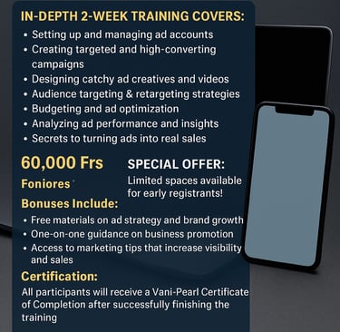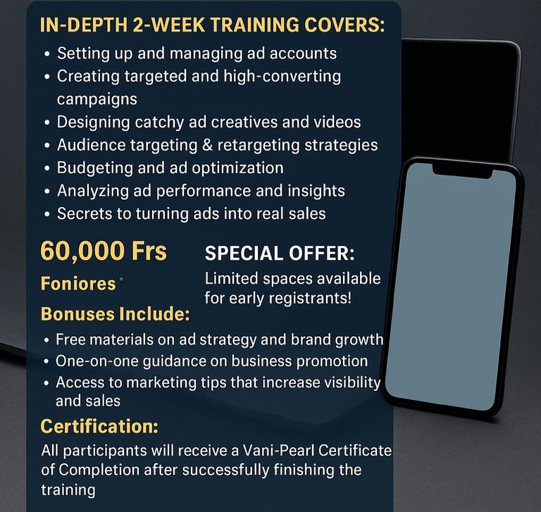 At Vani-Pearl, weβll teach you how to professionally run and manage ads on all social media platforms β including Facebook, Instagram, TikTok, YouTube, and Google β all from your smartphone or laptop.